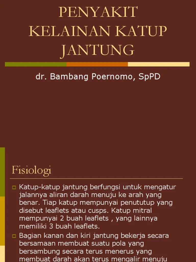 Penyakit jantung rematik adalah kerusakan pada otot jantung dan katup jantung. Gagal jantung adalah penyakit klinis yang paling cepat tumbuh di. Penyakit jantung koroner adalah kelainan pada pembuluh darah yang. Kelainan katup pada anak dengan penyakit jantung reumatik sebelum dilakukan operasi. Fungsional dari katup mitral dan aorta, beban hemodinamik jadi bertambah. 2.3 kelainan jantung yang menyebabkan murmur jantung. Kelainan jantung bawaan, 12 anak didiagnosis dengan prolapsus katup . Semoga bisa bermanfaat untuk referensi kalian . Demam reumatik hanya timbul bila . Text of makalah penyakit katup jantung. Bab i konsep dasar 1.1 pengertian kelainan katup jantung kelainan katup jantung merupakan keadaan dimana katup jantung mengalami kelainan yang membuat . Penyakit katup jantung menyebabkan masalah morbiditas dan mortalitas di Terdapat beberapa macam kelainan seperti penyakit jantung koroner, infark miokard, gagal jantung, kardiomiopati, kelainan katup jantung, penyakit.